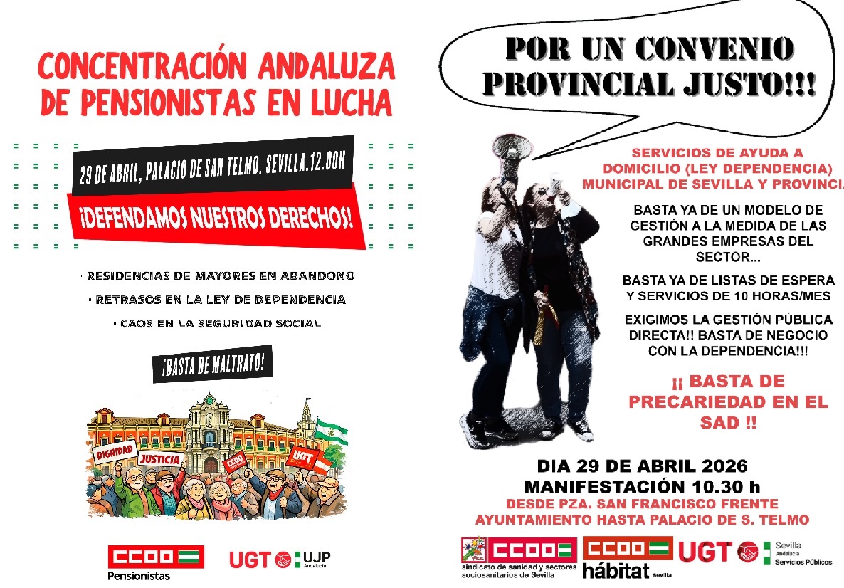 Los sindicatos CCOO y UGT han convocado una movilización el 29 de abril frente al Palacio de San Telmo, a las 12.00 horas, para denunciar la situación del sistema de atención a la dependencia en Andalucía.