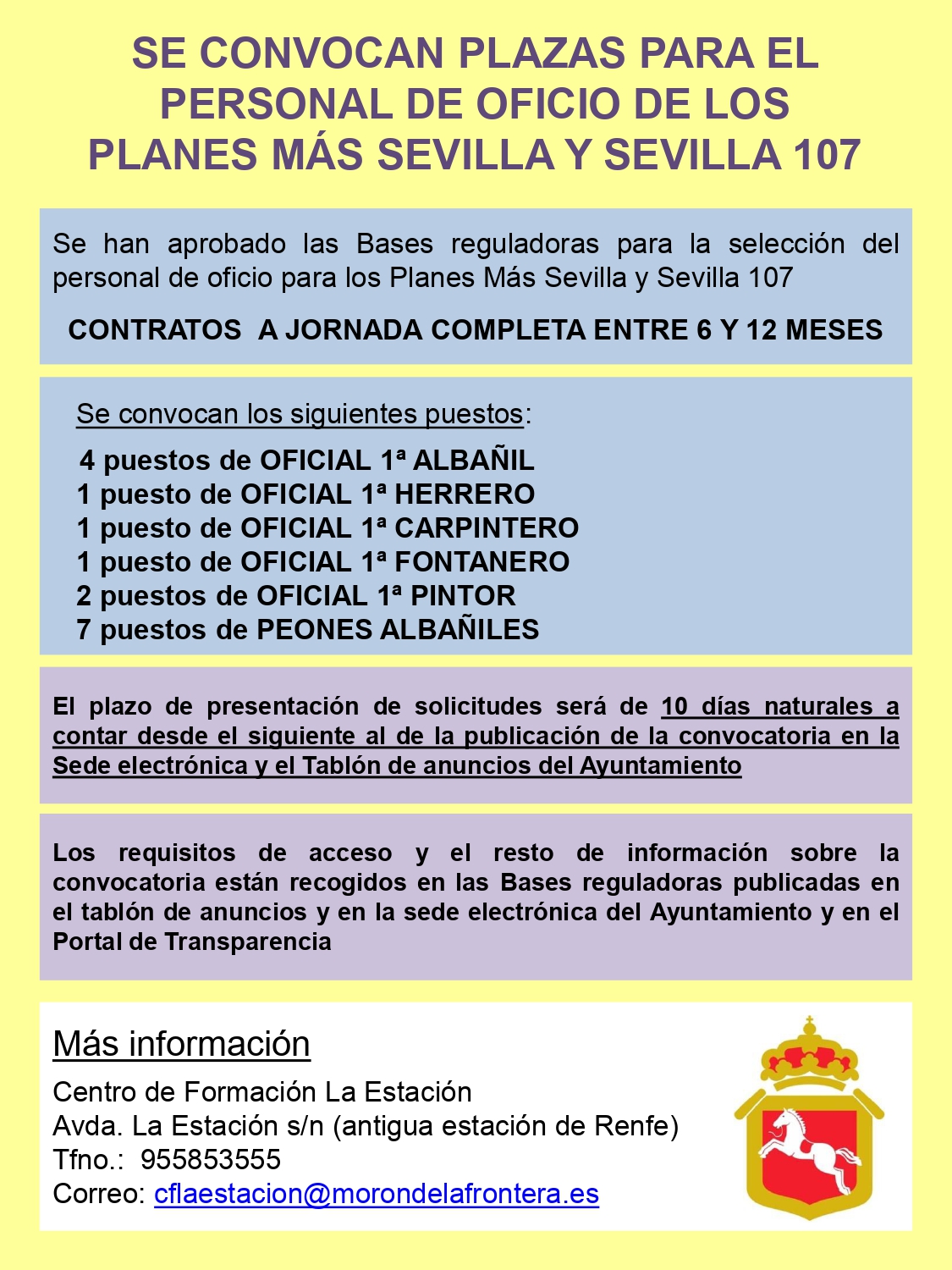 El Ayuntamiento de Morón ha anunciado la convocatoria de plazas para cubrir puestos de albañiles, pintores, fontanero, herrero, carpintero y peones albañiles para las actuaciones denominadas “Plan de Urbanidad” del Programa Municipal Más Sevilla y “Mejoras en Centros Escolares y Edificios Públicos” del programa municipal Sevilla 107 , ambos programas financiados por Diputación.