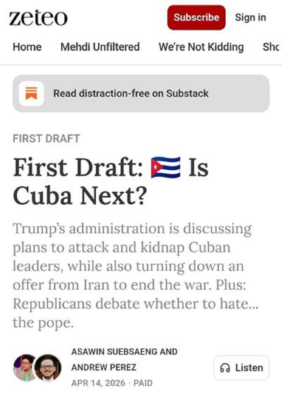 El boletín de Zeteo añade declaraciones públicas del magnate republicano que no hacen más que encender las alarmas. «Quizás nos demos una vuelta por Cuba después de que terminemos con esto», dijo Trump esta semana, refiriéndose a su desastrosa agresión a Irán, junto al estado sionista. Hace apenas dos semanas, el mandatario ya había espetado: «Cuba será la siguiente».
