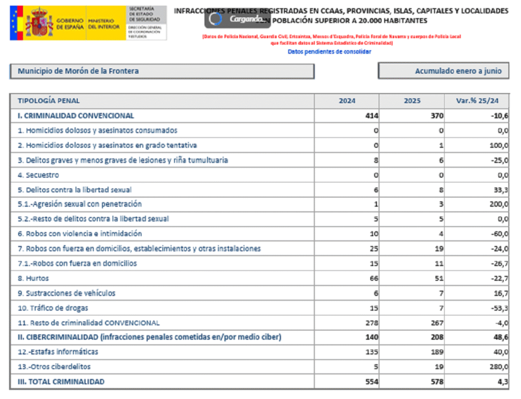 El Subdelegado del Gobierno en Sevilla, Francisco Toscano, tras una reunión formal con la Junta Local de Seguridad de Morón de la Frontera, celebrada ayer jueves, informó parcialmente de los datos de criminalidad en el primer semestre de 2025 y subrayó la reducción de la criminalidad convencional del 10%, omitiendo que en el balance global la criminalidad aumentó en el primer semestre en casi el 5%, y lo que es más preocupante, que existen aumentos en los delitos más graves que deberían obligan a reforzar la vigilancia y la prevención.